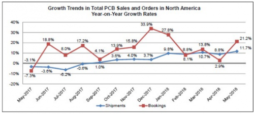 2018年7月4日,美國伊利諾伊州班諾克本 — IPC — 國際電子工業聯接協會? 發布了《2018年5月份北美地區PCB行業調研統計報告》。報告顯示5月份北美PCB訂單量和出貨量均以強勁的速度增長。